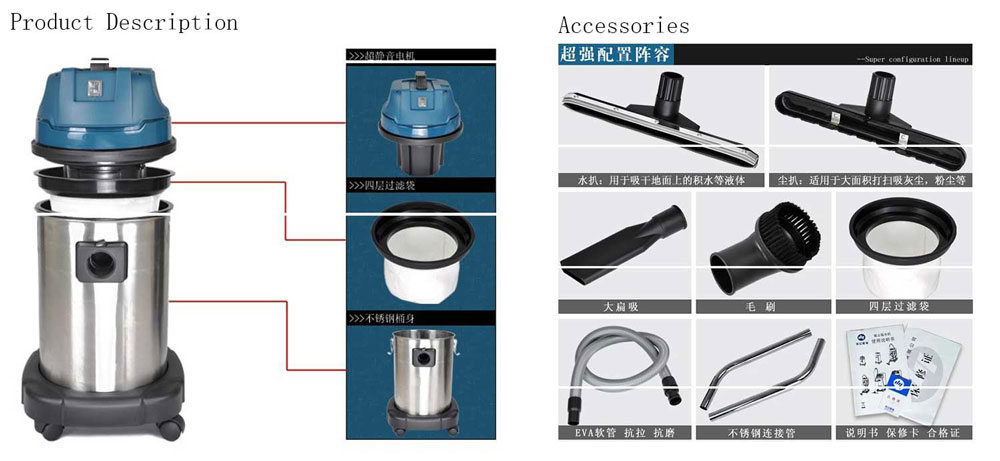 Он использует немецкую бимодальную технологию, автоматическую систему циркуляции и может непрерывно работать в течение 600 часов. Аксессуары такие же, как у больших коммерческих пылесосов. 38 больших диаметров, влажный и сухой, пыль и вода. Двойное отверстие для выпуска отработанного воздуха на 360 ° используется для обеспечения системы охлаждения двигателя, а пылесборник изготовлен из нержавеющей стали.